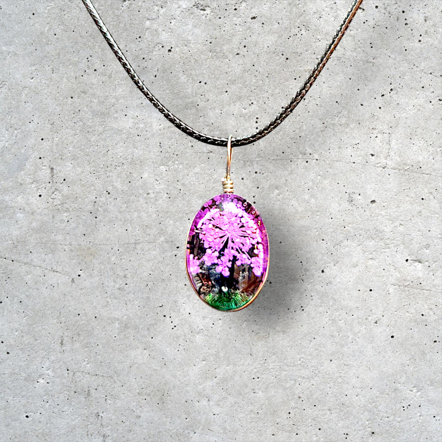 STYLE: Unique translucent pendant necklace features real dried flowers preserved in resin and surrounded by silver wire setting on an 18" rope necklace with a lobster-claw clasp and adjustable extender. The natural properties of real flowers provide a one-of-a-kind look to each piece. The image may show a slight difference in accordance too the actual flowers in color and composition.