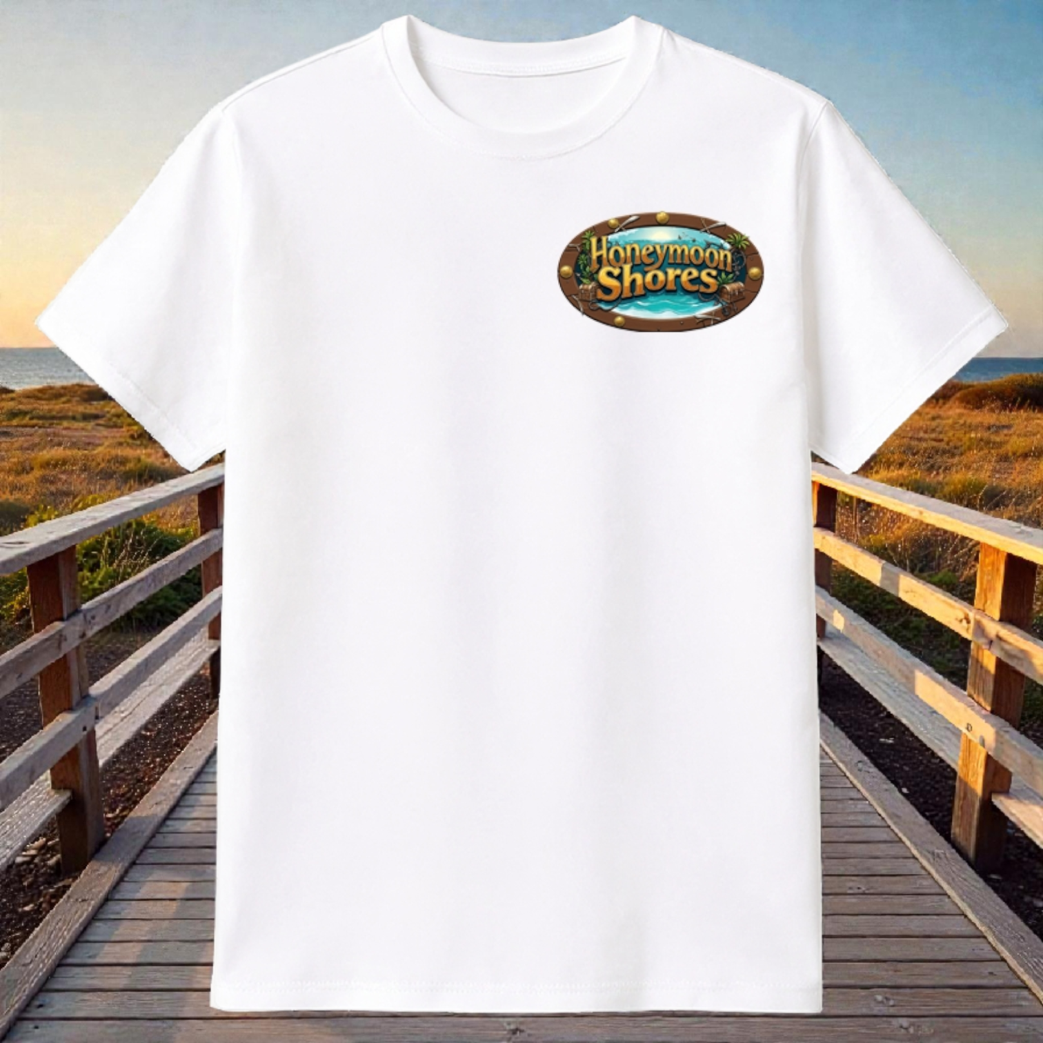 Description: A soft, breathable cotton tee printed with a playful undersea scene — a curious octopus framed like a porthole and labeled with a sunny beach name. Wear it to bring a little coastal charm to everyday life: the relaxed cut and medium-weight fabric keep you comfortable from morning coffee to dusk walks on the boardwalk. The print sits on the back for a splash of personality while the clean crew neck and classic fit keep the silhouette simple and wearable. Product features