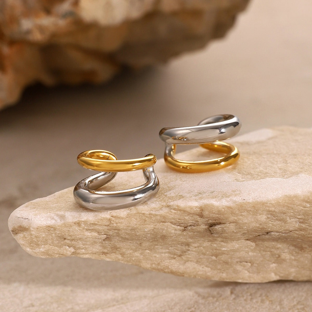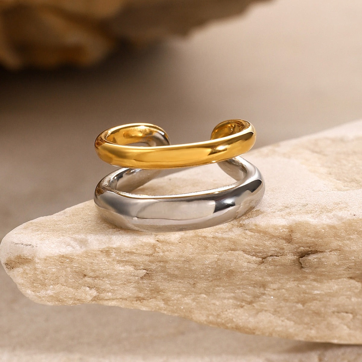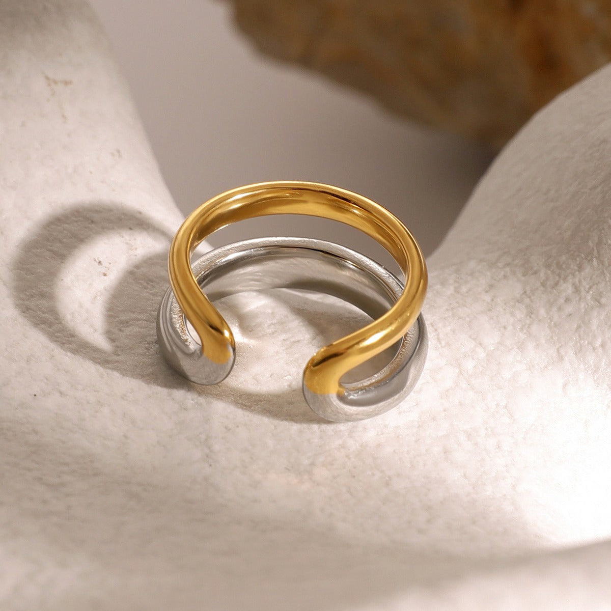 This 18K gold simple personality double-layer with two-color color matching design earring ring set has the following features: