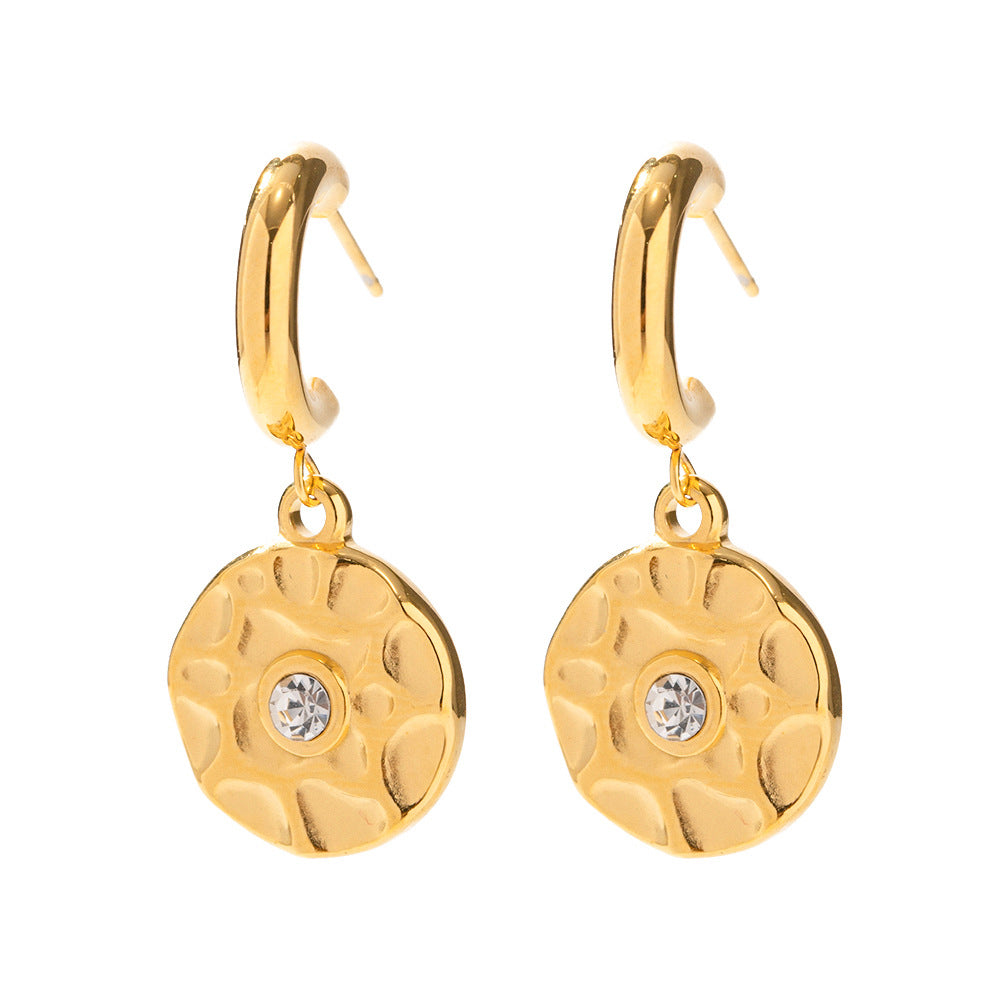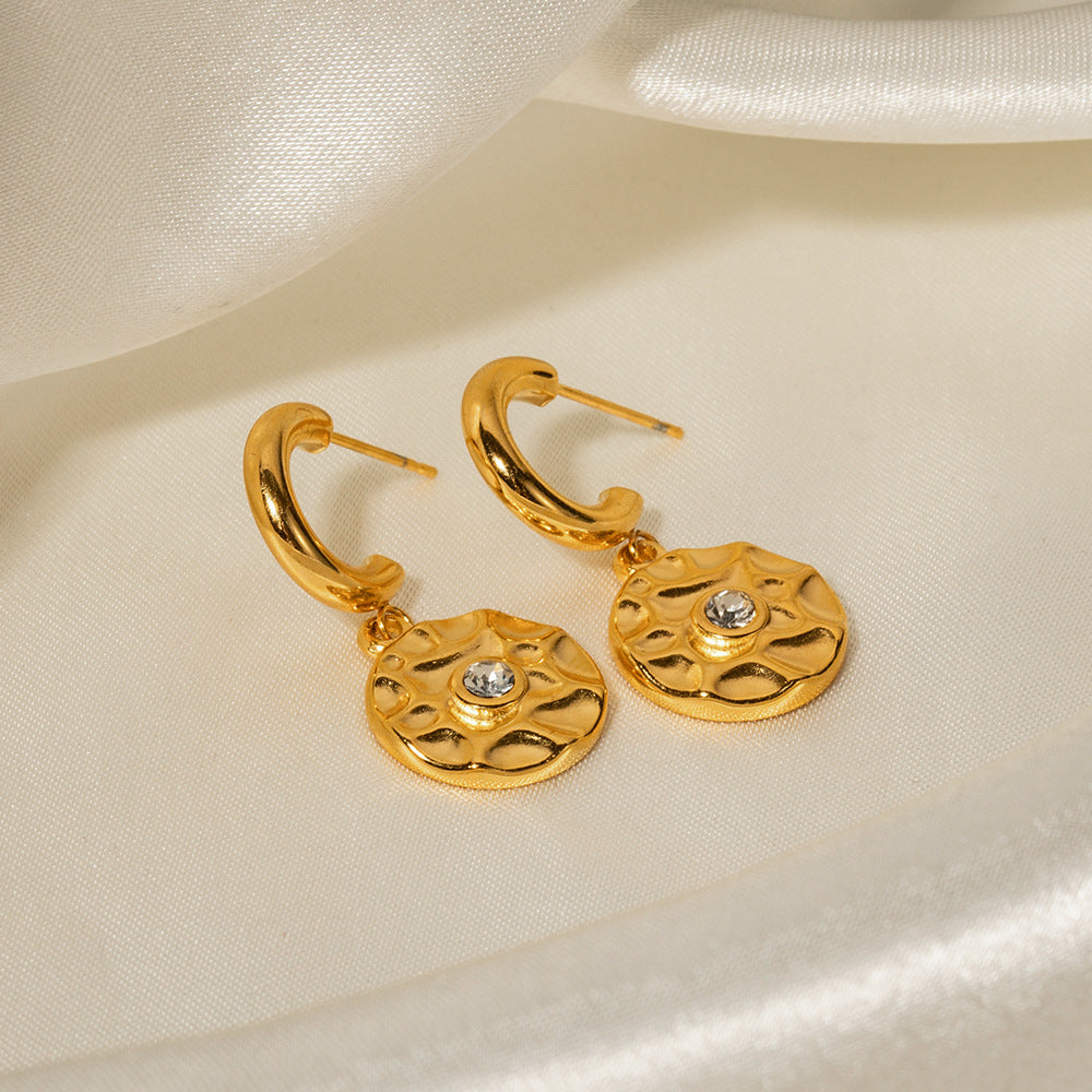 The design of the earrings is mainly circular, and the detailed geometric texture pattern adds its unique charm and fashion sense. In the center of the earrings, a sparkling diamond is inlaid, adding a gorgeous and delicate visual effect to the whole earrings.