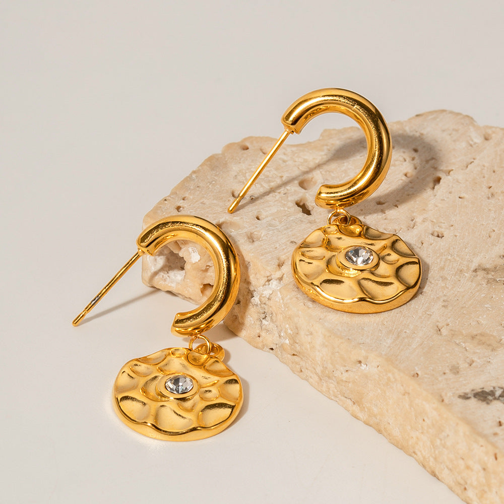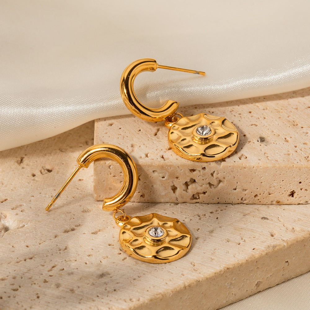 18K Gold Exquisite Noble Geometric Texture Inlaid Diamond Round Earrings
