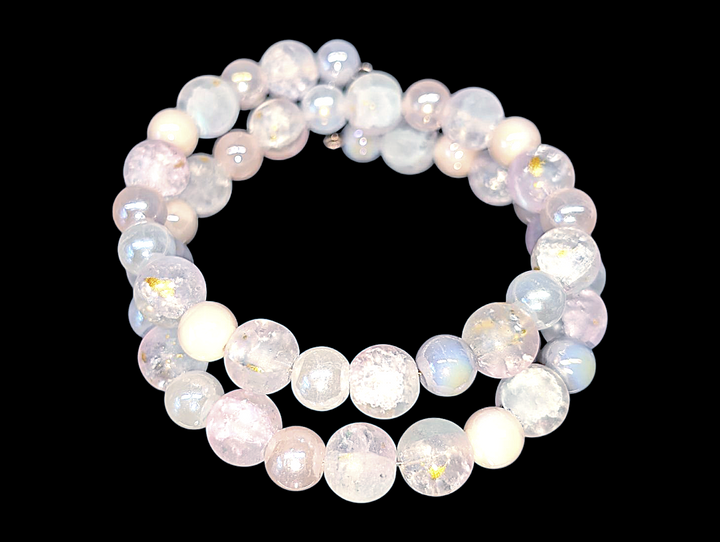 MATERIAL - Glass, Memory Wire, Beads. No hassle closing any clasps with this adjustable memory wire bangle. Perfect for people in a hurry that wants to look exquisite.