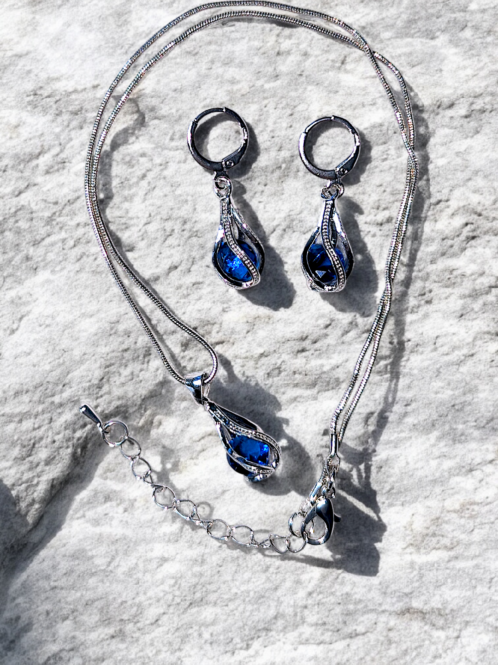 Silver Blue Drop Necklace Earring Set