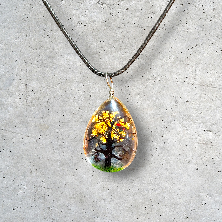 MATERIAL: Dried, Pressed Flower Tree Plant Resin Pendant with Lacework in translucent-shaped pendant.